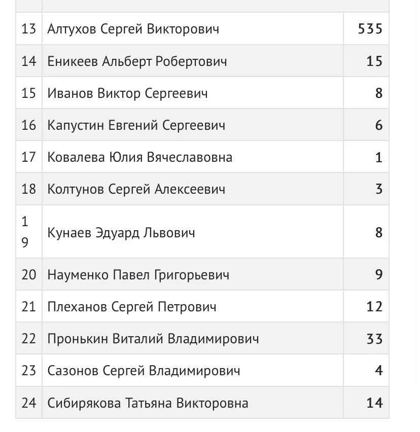 В систему ГАС «Выборы» внесены следующие данные: Алтухов — 535 голоса, Иванов — 78, Капустин — 6, Ковалева —1, Колтунов — 3, Пронькин —133, Сазонов — 4.