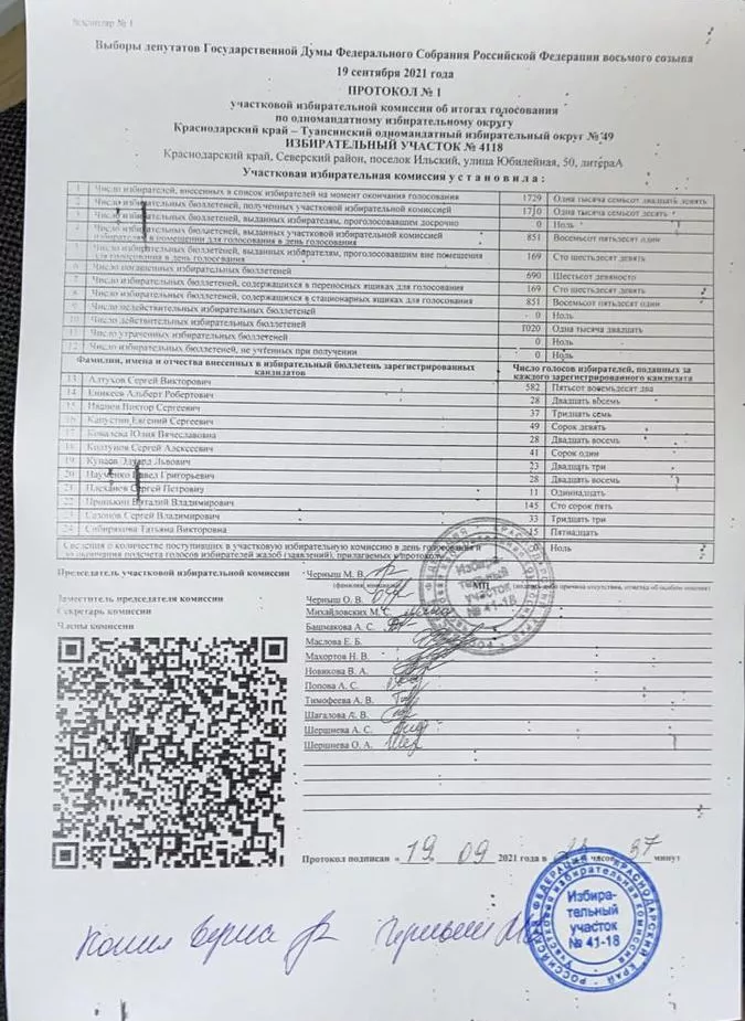 На участке № 41-26 у Алтухова 255 голосов. Иванов получил 48 голосов, а Капустин — 46. Голоса за других кандидатов следующие: Юлия Ковалева («Зеленые») — 31, Сергей Колтунов («Партия пенсионеров») — 33, Виталий Пронькин (КПРФ) —133, Сергей Сазонов («Справедливая Россия») — 44.
