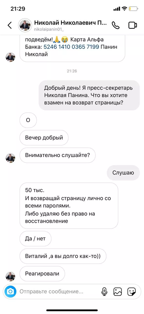 6 октября пресс-секретарь мэра связался с мошенниками и узнал их требования. Инстаграм-аккаунт оценили в 50 тыс. рублей, а в противном случае пообещали удалить. Панин сообщил, что связался с поддержкой социальной сети.