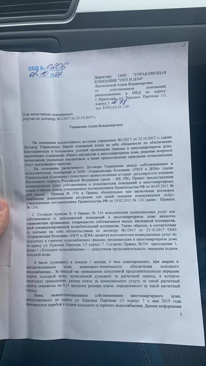 Женщина жаловалась в управляющую компанию «Светлограда» «Уют и Дом», ей ответили, что вины компании в отсутствии воды нет, и говорили, что проблемы с водоснабжением происходят из-за МУП «Водоканал». Также Ольга обращалась в ЕДДС Краснодара. Там ей говорили, что перебои происходят из-за поломанного трансформатора. Даже после ремонта у него не хватает мощности, поэтому ежедневно с 20:00 до 22:00 дом будет без воды. Но воды в кранах нет не только по вечерам.