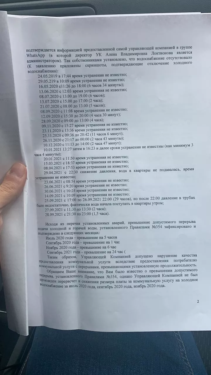 Директор компании все время ссылалась на аварии в МУП «Водоканал». В чате жилого комплекса она писала, что у водоканала сгорели электрические автоматы или не хватает давления для запуска насоса. Несколько раз жильцам привозили питьевую воду.