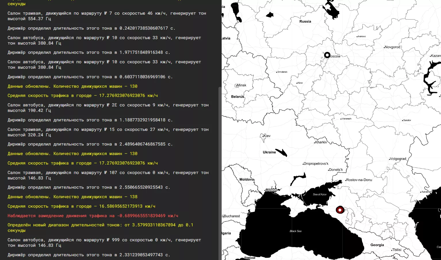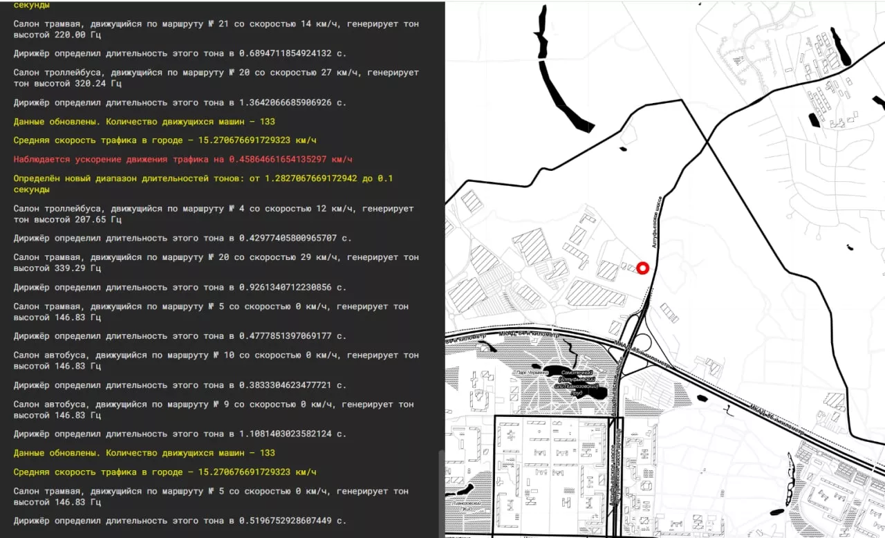 «Да, звуки генерируются алгоритмом, но он будет молчать без материала — конкретных решений о торможении или ускорении, которые водители трамваев и троллейбусов принимают в ту или иную минуту. Поэтому в разное время суток насыщенность звука зависит от интенсивности трафика и числа салонов на маршрутах», — пояснил автор проекта Максим Алёхин.