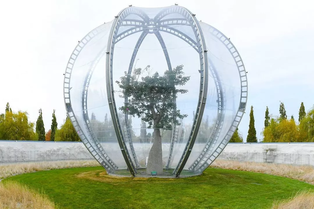 Цветет дерево осенью. Это уже второй раз, когда оно распускает свои цветы в парке. А чтобы дерево не замерзло и продолжало радовать цветами, на холодное время года его накрыли специальным куполом.