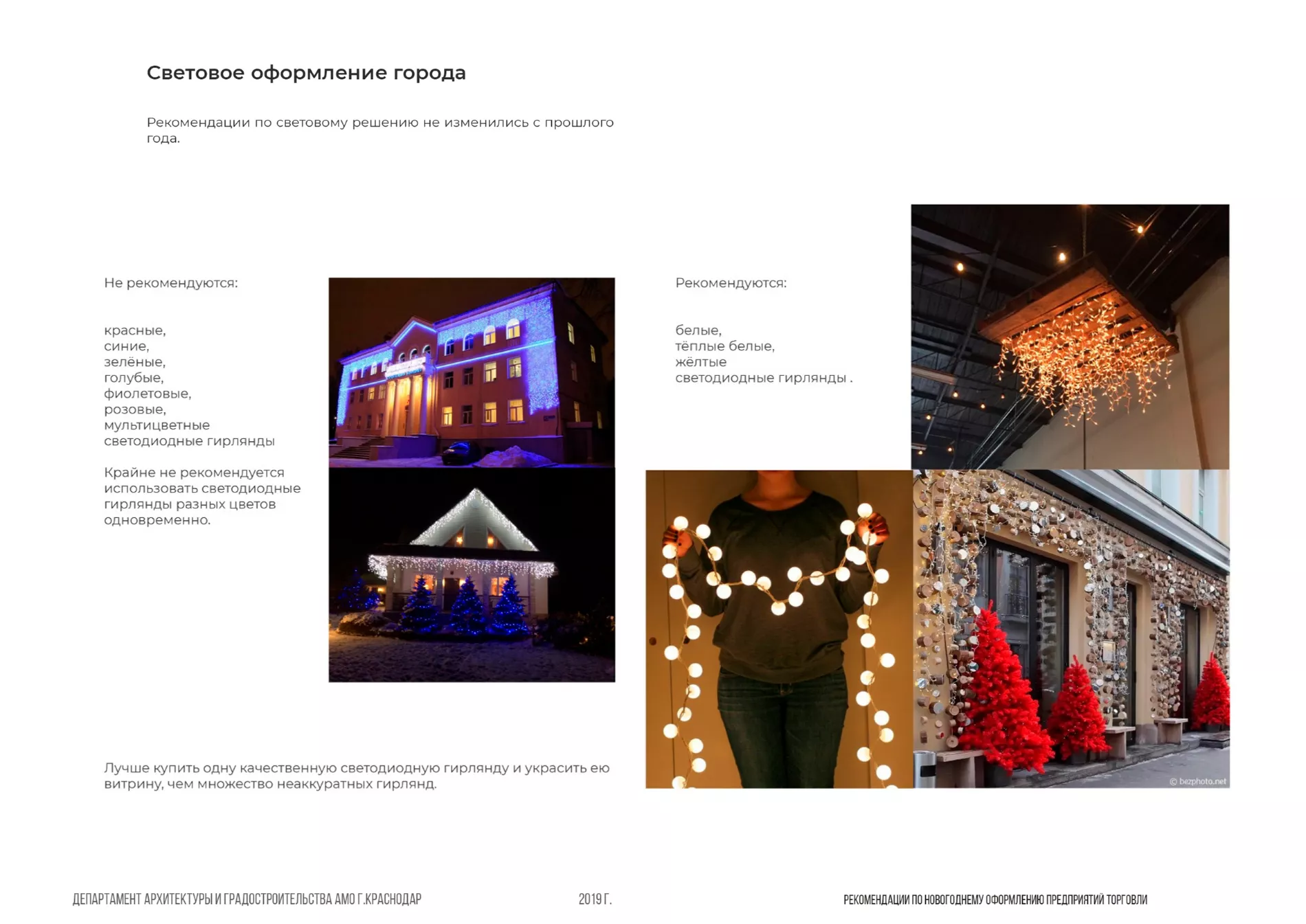 Напомним, при оформлении фасадов рекомендуют использовать спокойные приглушенные тона и не сочетать более двух цветов. Департамент архитектуры и градостроительства не советует использовать красные, синие, зеленые, голубые, фиолетовые, розовые и разноцветные гирлянды. Предпочтение отдали белым, теплым белым и желтым светодиодным гирляндам.