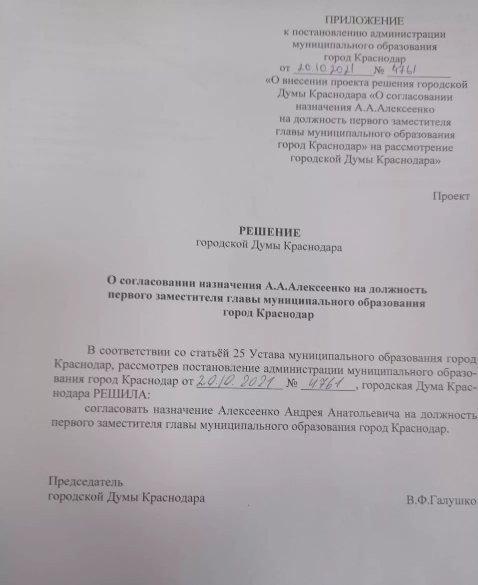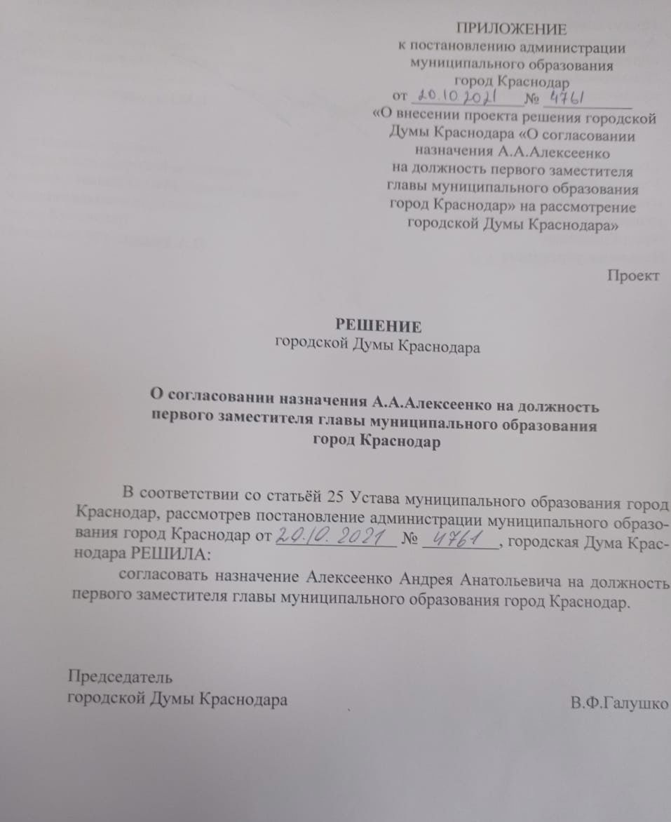 Утром 21 октября депутаты городской думы единогласно согласовали на пост первого замглавы Краснодара кандидатуру вице-губернатора Андрея Алексеенко.