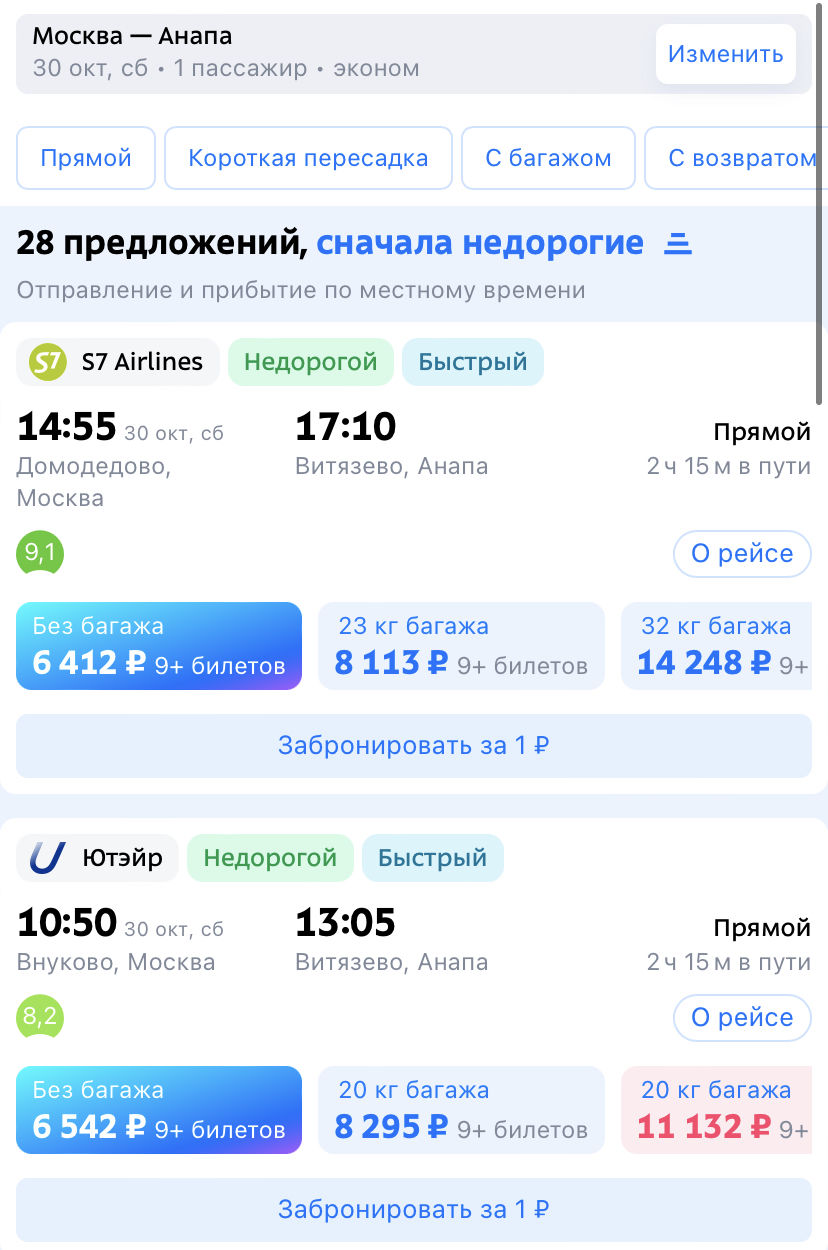 На сайте aviasales самый дешевый билет из Москвы в Сочи 24 октября стоит 1275 рублей. 30 октября — уже 4864 рубля. Оба рейса с пересадкой.