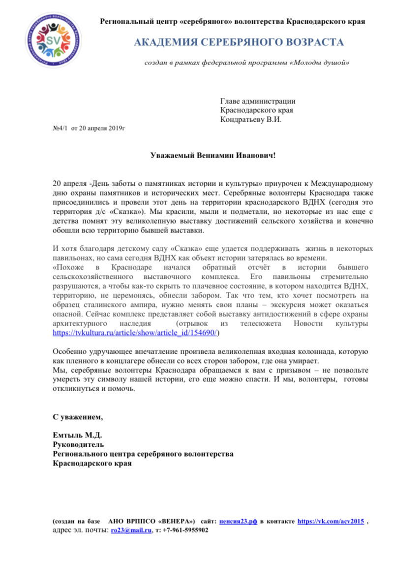 «Особенно удручающее впечатление произвела великолепная входная колоннада, которую, как пленного в концлагере обнесли со всех сторон забором, где она умирает. Мы, серебряные волонтеры Краснодара, обращаемся к вам с призывом — не позвольте умереть этому символу нашей истории, его еще можно спасти», — говорится в обращении.