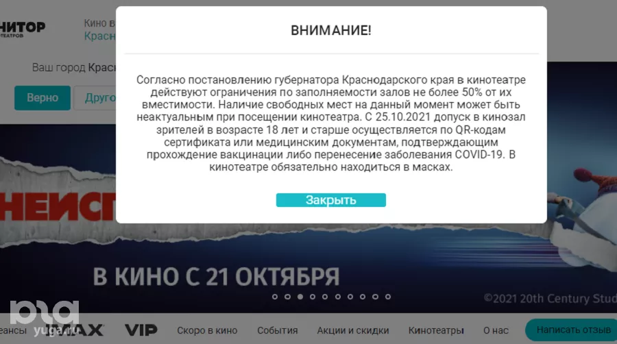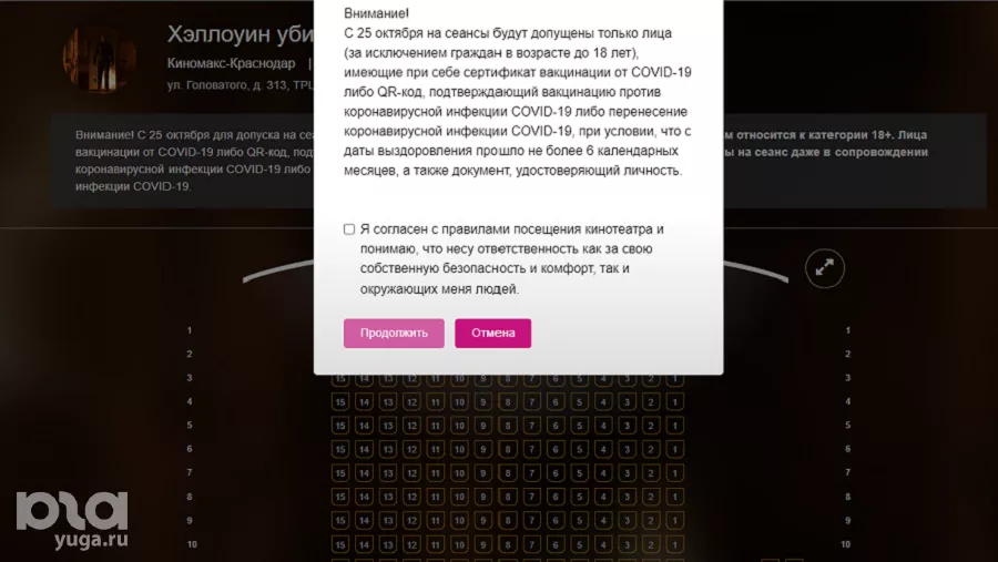 23 октября оказалось, что QR-коды потребуются в Краснодарском крае и при посещении кинотеатров. Такое предупреждение Юга.ру обнаружили на сайтах сети кинотеатров «Монитор» и «Киномакс». Интересно, что при онлайн-бронировании через сайт «Формула кино» (в Краснодаре кинотеатр находится в ТРЦ «OZ-молл») никакого оповещения о QR-кодах не появилось.