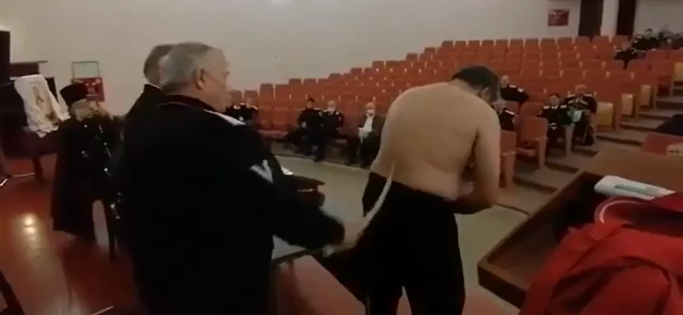 Также газета выложила видео, на котором по старой казачьей традиции председатель Совета стариков Иван Сопнев трижды отметил его нагайкой по голой спине.