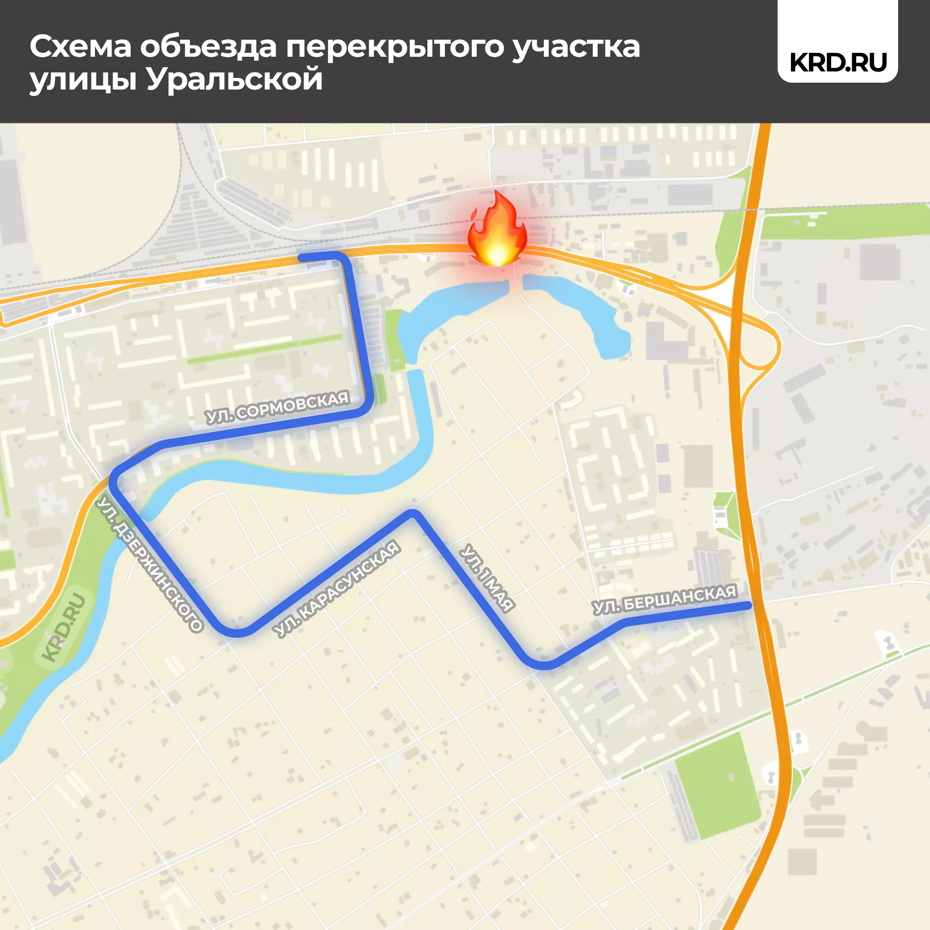 В пресс-службе администрации Краснодара сообщили, что из-за пожара изменилась схему движения транспорта в направлении выезда из города. Автомобилистам, которые двигаются в направлении выезда по Уральской рекомендуют ехать по Сормовской и выезжать из города через Пашковский микрорайон, по улице Бершанской или 1 Мая, а оттуда — на трассу М 4 «Дон».