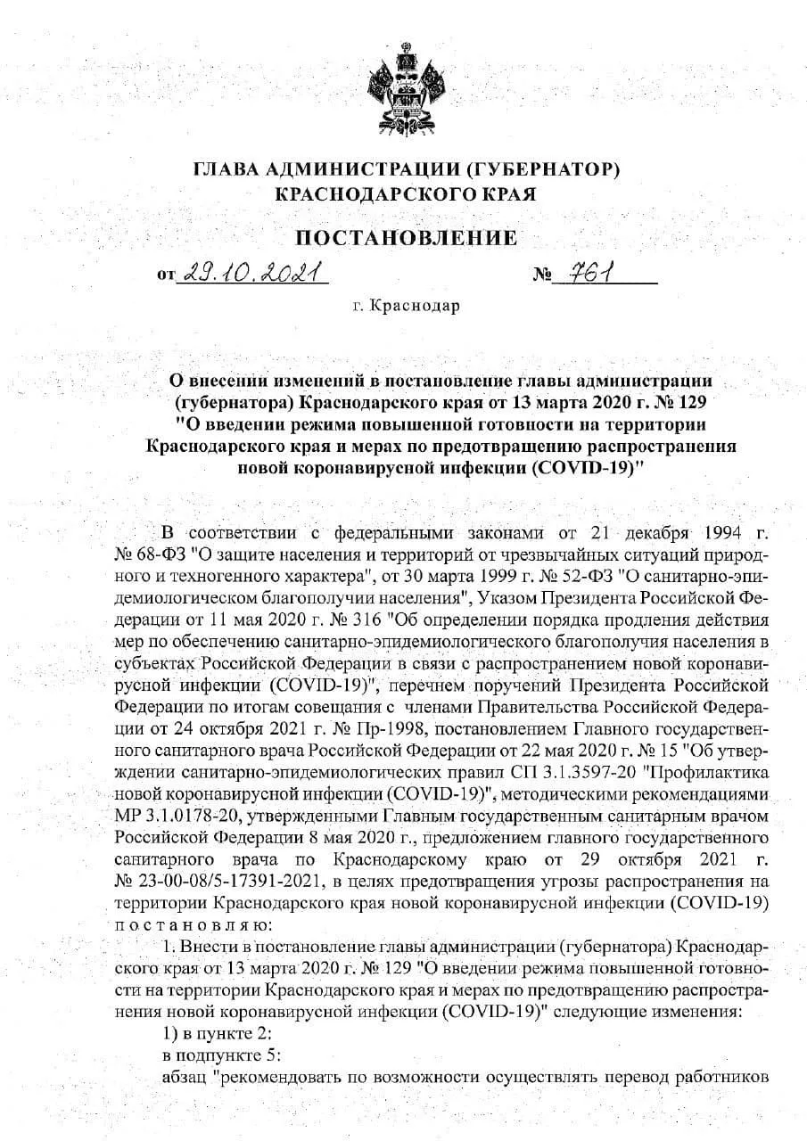 29 октября в пресс-службе администрации Краснодарского края сообщили, что Кондратьев подписал постановление об ужесточении режима повышенной готовности. С 1 ноября на Кубани помимо уже действующих ограничений добавятся следующие: