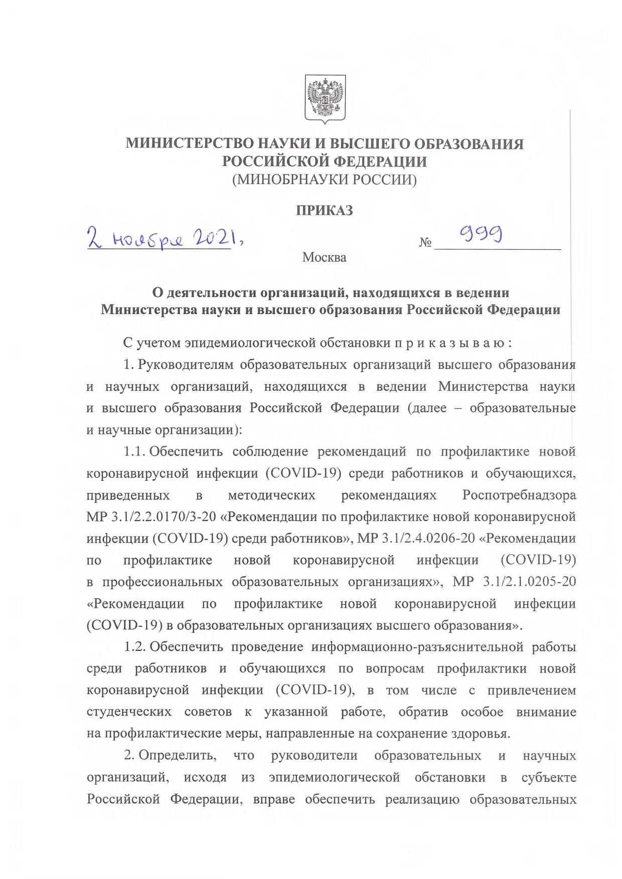 2 ноября в Минобрнауки России издали указ о деятельности образовательных учреждений с учетом эпидемиологической обстановки. В нем сказано, что с 8 ноября вузы и научные организации могут продолжить обучение в виде самостоятельной работы или в удаленном формате при помощи дистанционных технологий.