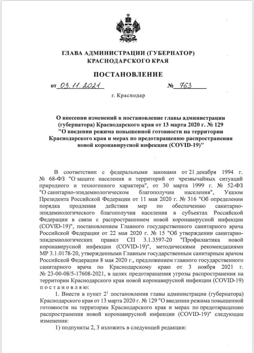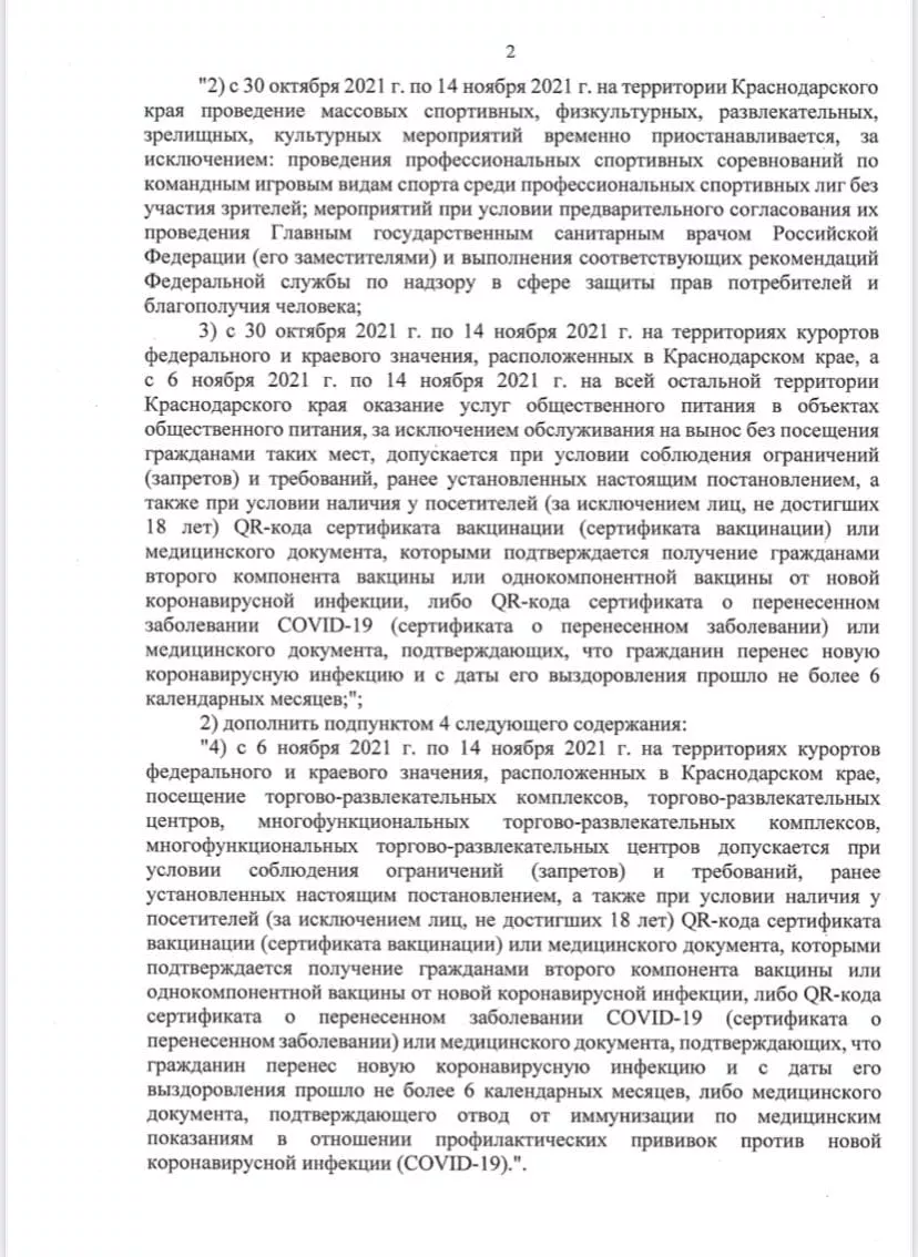 3 ноября губернатор Кубани Вениамин Кондратьев сообщил, что в связи с эпидемиологический обстановкой введут новые ограничения. Теперь с 6 по 14 ноября для посещения общепита на всей территории края потребуется справка или QR-код о вакцинации от коронавируса или перенесенном заболевании. В городах-курортах ужесточили требования — QR-коды нужны даже для посещения торговых центров. Заселиться в отель все еще можно и с первым компонентом вакцины.