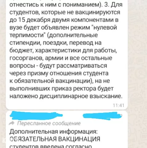 На следующий день студентам объявили, что те, кто до 15 декабря не вакцинируется двумя компонентами, лишатся дополнительных стипендий, поездок, возможности перевода на бюджет и характеристик для работы. Все вопросы в вузе будут рассматривать «через призму отношения студента к обязательной вакцинации». На тех, кто не выполнит приказ ректора, обещали наложить дисциплинарное взыскание.