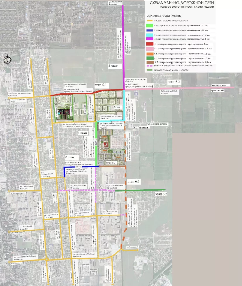 Глава Прикубанского округа совместно с застройщиками уже представил карту, на которой выделены участки, нуждающиеся в реконструкции. Также уже разработан предварительный план преобразования дорог из шести этапов.