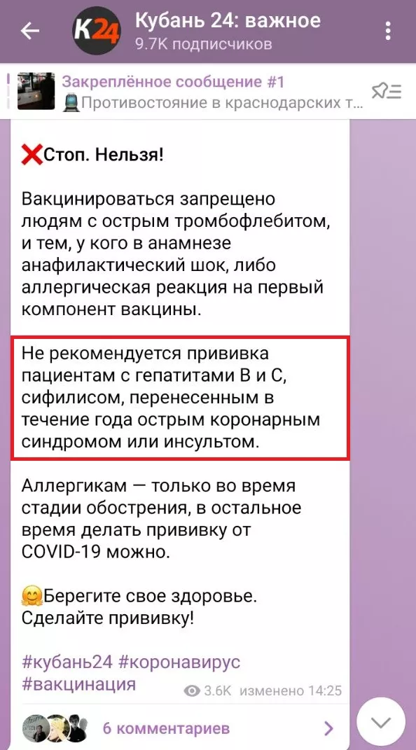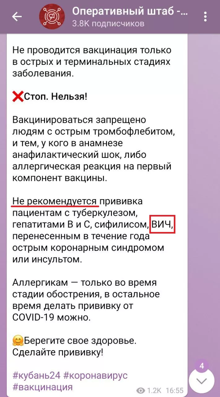 12 ноября в телеграм-канале фонда «СПИД.ЦЕНТР» рассказали, что интернет-портал «Кубань 24» неверно причислил положительный ВИЧ-статус и еще несколько заболеваний к противопоказаниям к вакцинации от коронавируса.