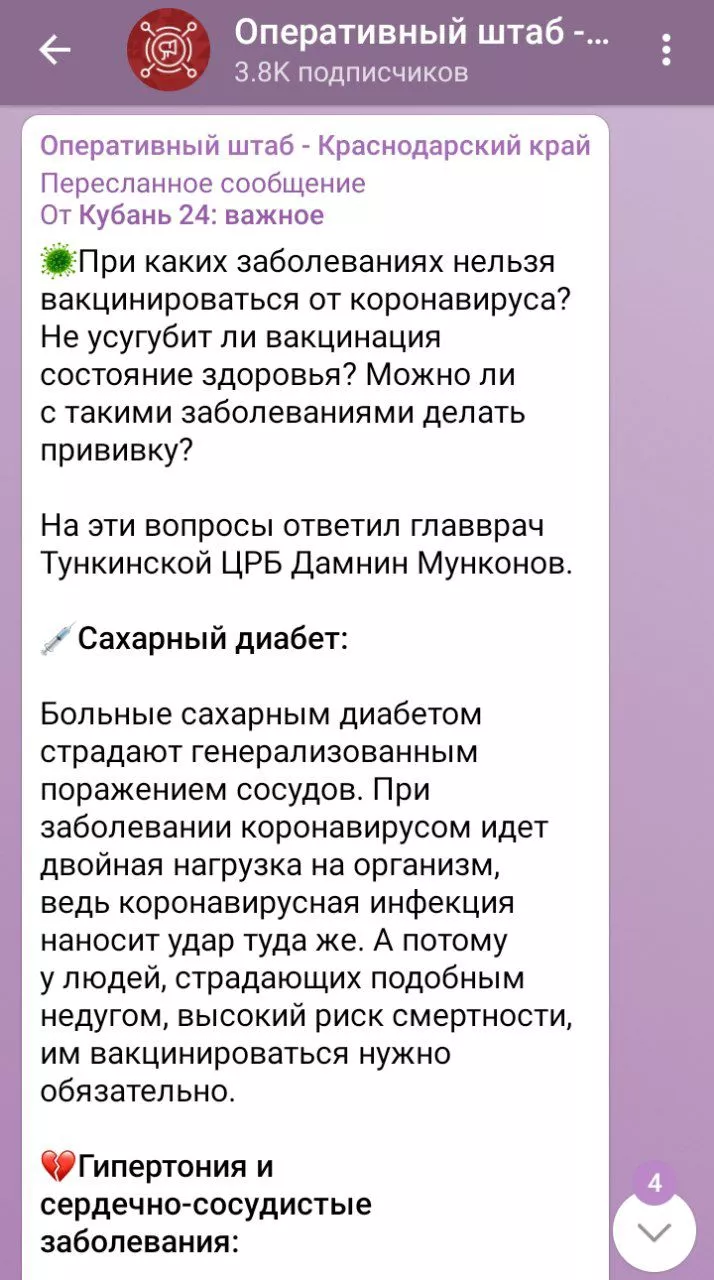 Эту информацию репостнул оперштаб Краснодарского края — официальный информационный ресурс по борьбе с коронавирусом. Позже журналисты отредактировали пост, а вот в телеграм-канале оперштаба информация осталась неизменной.