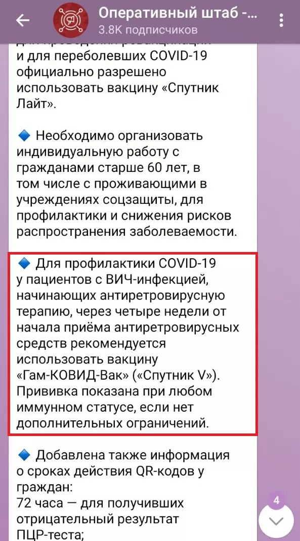 Отметим, что до репоста материала «Кубань 24» тот же оперштаб Краснодарского края 7 сентября 2021 года публиковал другую информацию о вакцинации ВИЧ-положительных людей, где говорилось, что независимо от иммунного статуса рекомендуется сделать прививку, лучше — «Спутником V». Если человек только начинает принимать антиретровирусные препараты, прививку стоит поставить после четырех недель терапии.