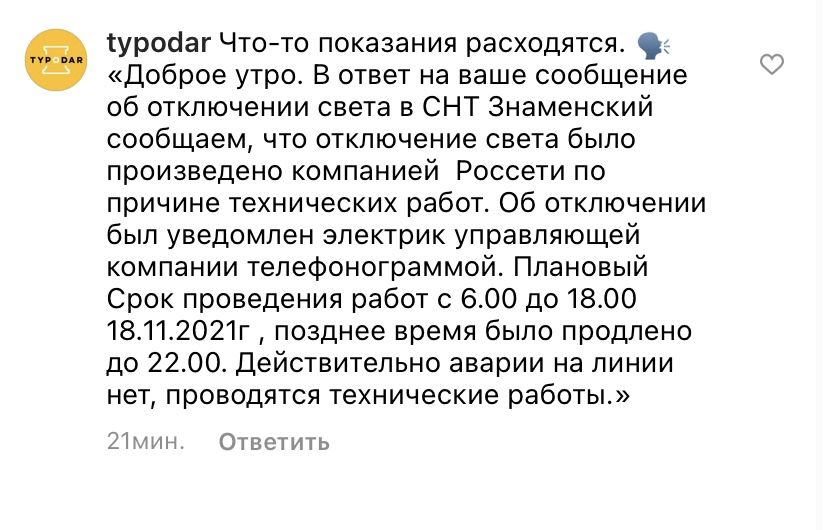 В комментариях к посту «Туподар Краснодар» написал, что электричество отключила компания «Россети» по причине технических работ. Плановый срок проведения был с 6:00 до 18:00 18 ноября, но затем время продлили до 22:00.