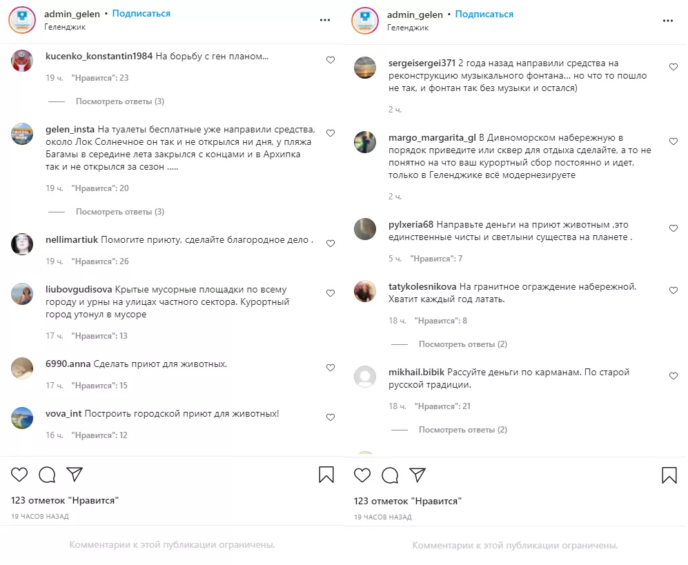 Впрочем, в комментариях инстаграма заметили, что туалеты не работают. Самыми частыми и набравшими больше всего лайков стали просьбы создать приют для животных. Также популярными комментариями стали советы направить курортный сбор на борьбу с генпланом.