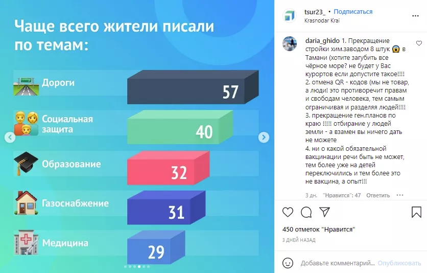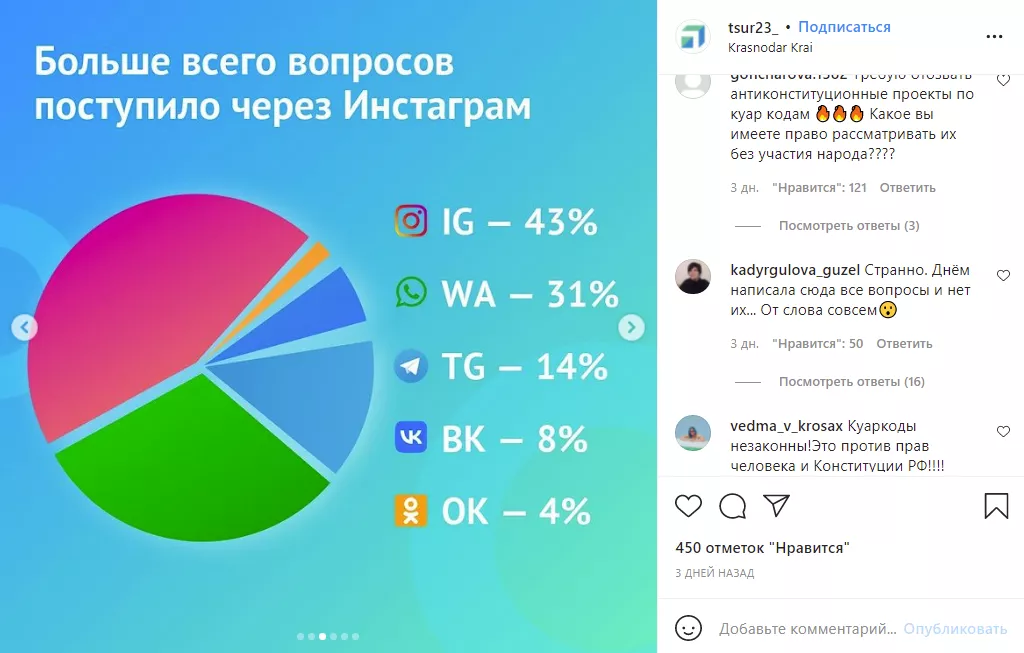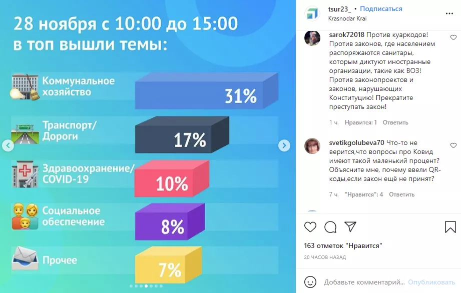 В ведомстве заявили, что более 80% обращений поступает через соцсети и мессенджеры, больше всего — в инстаграме (43%). Но в отчетах разных дней QR‑коды занимают не более 17%, хотя подавляющее большинство комментаторов в инстаграмах Кондратьева и Центра управления регионом критикуют именно QR‑коды и принудительную вакцинацию.