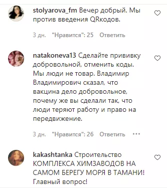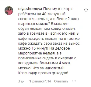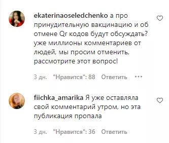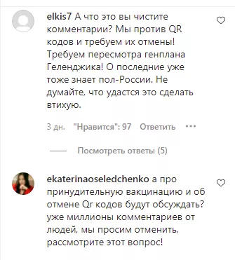 К 16:15 29 ноября публикации собрали в сумме 1465 комментариев, причем пользователи не раз жаловались на удаление предыдущего поста с негативными комментами о QR-кодах. Среди многих однотипных высказываний против QR-кодов как меры сегрегации и принуждения к вакцинации были и более своеобразные мнения. Например, пользователь с ником olya.shomova возмутилась непоследовательностью ограничений: она нашла нелогичным то, что нельзя посетить «с ребенком 40-минутный спектакль» или магазин обуви, но «в Ленте два часа шариться можно».