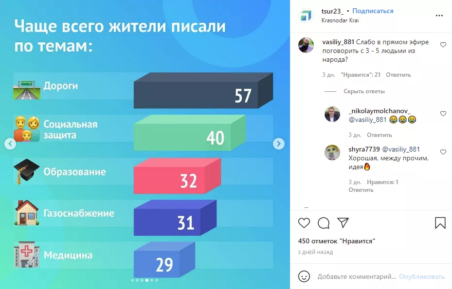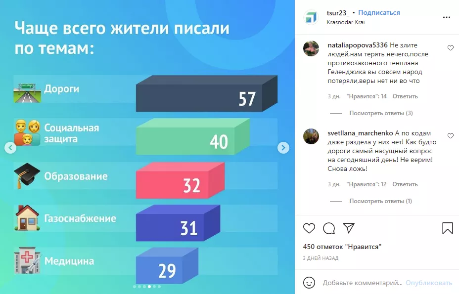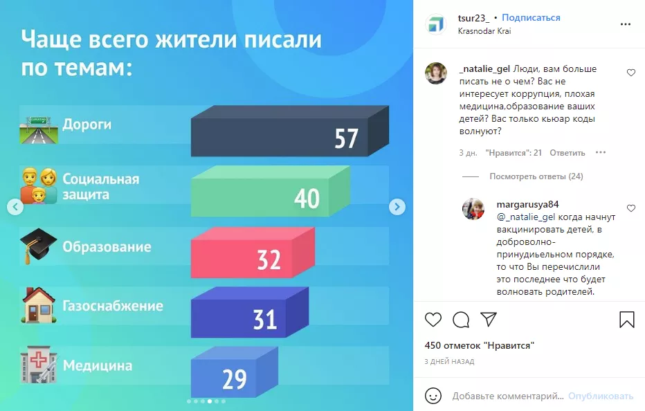 Также люди подвергали сомнению приводимую статистику по темам обращений. Так, пользовательнице svetlana_marchenko показалось странным, что у QR-кодов нет отдельного раздела в статистике, а по числу обращений лидирует категория «дороги». Но были и противоположные мнения: _natalie_gel написала: «Люди, вам больше писать не о чем? Вас не интересует коррупция, плохая медицина, образование ваших детей? Вас только кьюар-коды волнуют?»