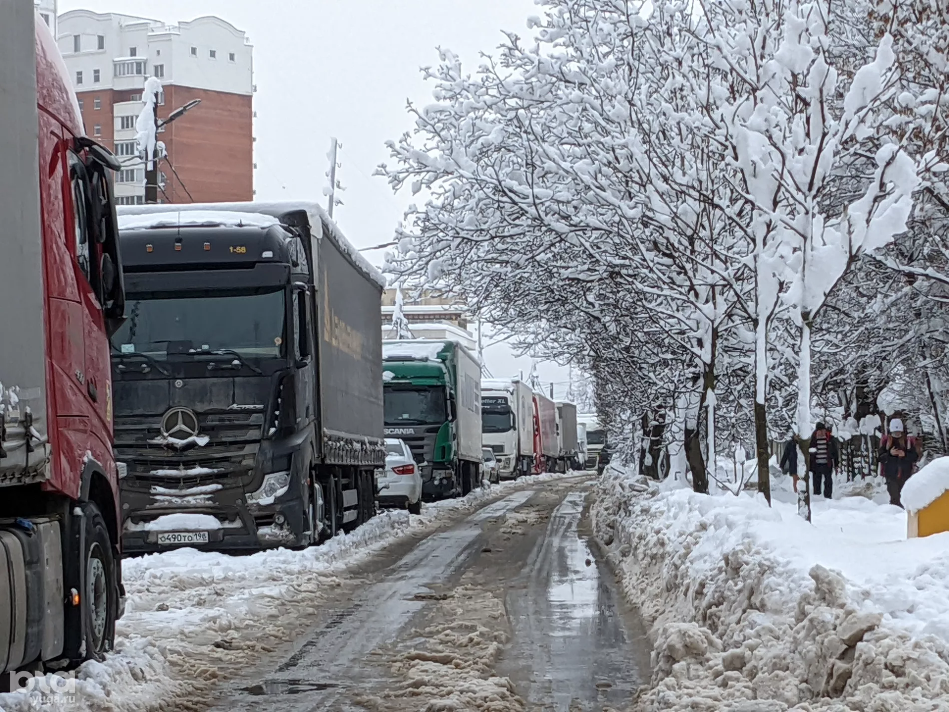 На улице Воронежской рядом с остановкой «Кирпичный завод» застряло несколько фур.