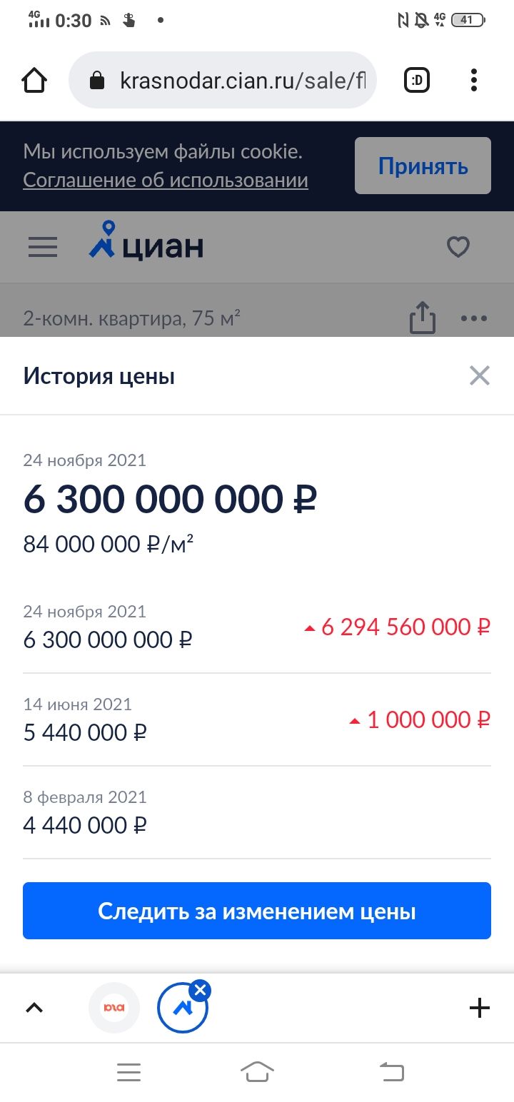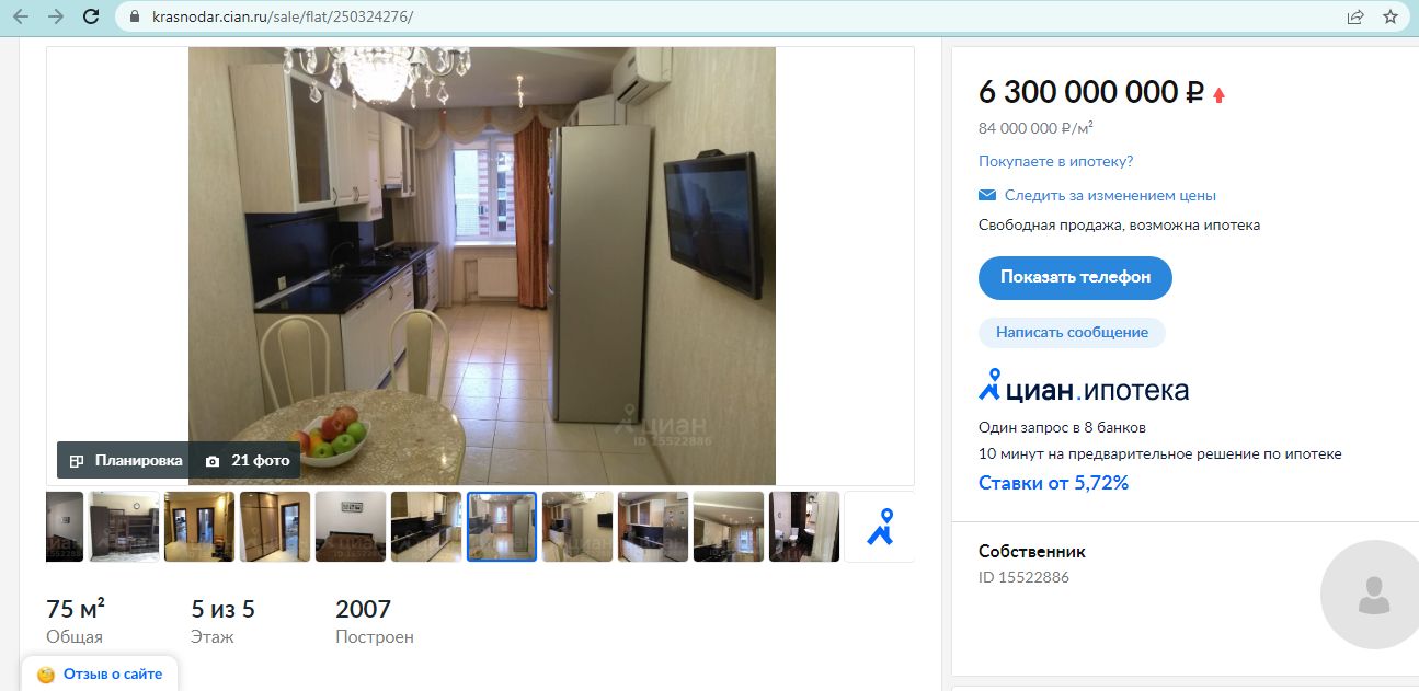 Обновлено: 16 февраля журналистка Юга.ру дозвонилась до владельца объявления и узнала, что цену в 6,3 млрд указали по ошибке — стоимость измеряется в миллионах. Предложение все еще актуально. Отметим, что цену на эту квартиру повышали дважды: в феврале 2021 года ее выставили на продажу за 4 млн 440 тыс. рублей, в июне подняли стоимость на 1 млн. А в ноябре пытались добавить еще миллион, тогда в цену и закралась ошибка. По состоянию на 17 февраля ее еще не исправили.