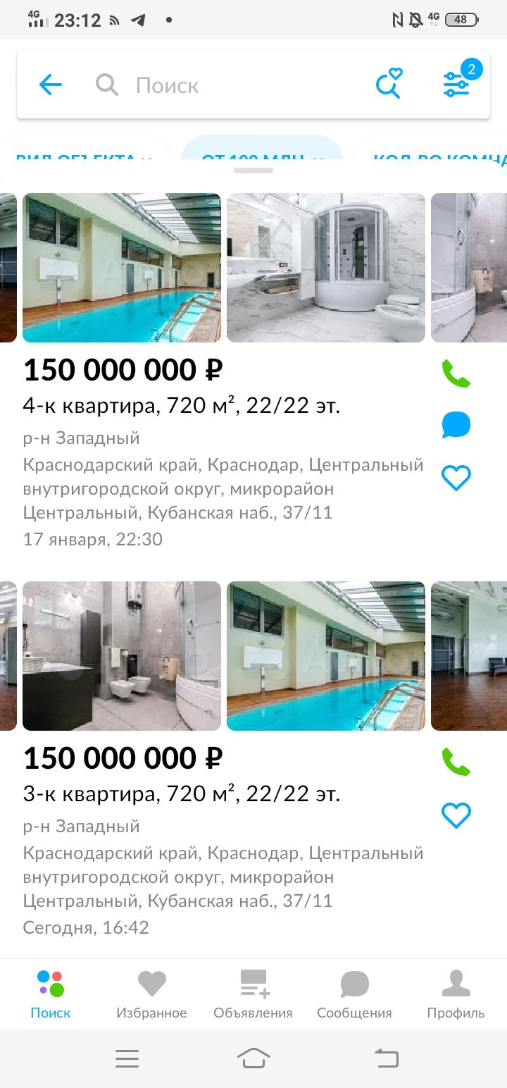 По поиску недвижимости стоимостью от 100 млн рублей сайт Avito показывает 14 объявлений. Самая высокая цена — 150 млн за трехкомнатную квартиру на последнем, 22 этаже, дом располагается на Кубанской Набережной. Правда, в этом доме продают и другую квартиру за 150 млн на 22 этаже — четырехкомнатную, но с теми же фотографиями.