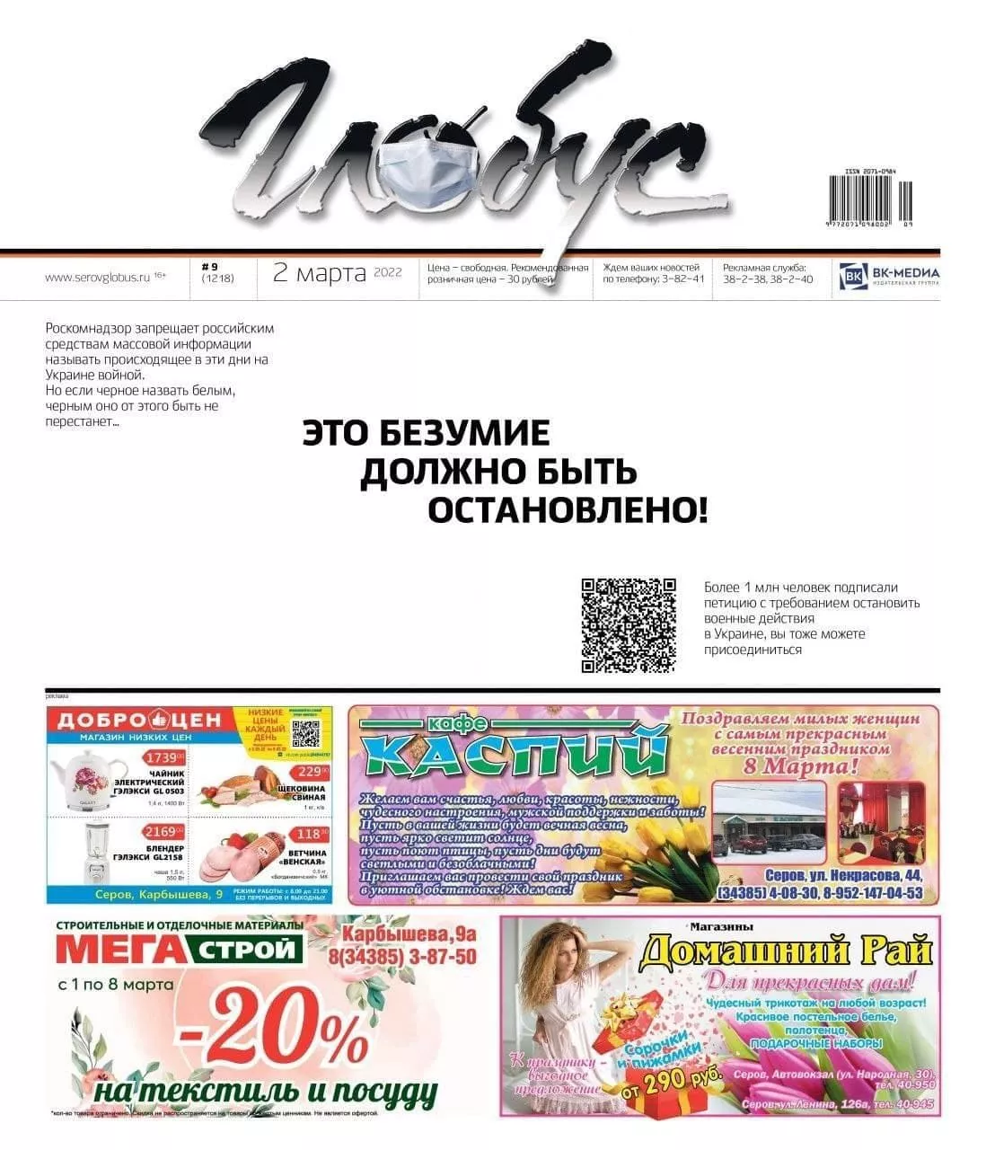 В Свердловской области МВД изъяли тиражи газет «Вечерний Краснотурьинск», «Глобус», «Вечерний Карпинск», «ПроСевероуральск.RU» и «Новый Качканар». Все издания, кроме последнего, входят в медиагруппу «ВК-медиа». Причиной изъятия послужили призывы остановить специальную военную операцию на Украине, сообщили сотрудники изданий.