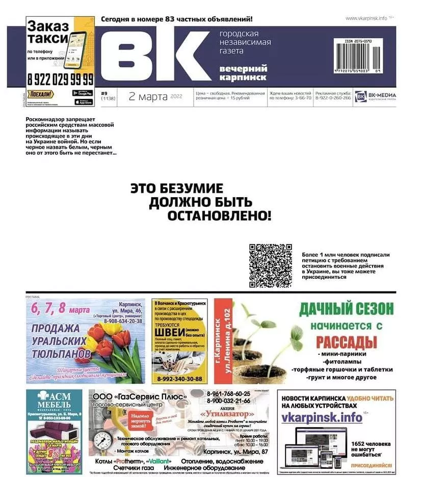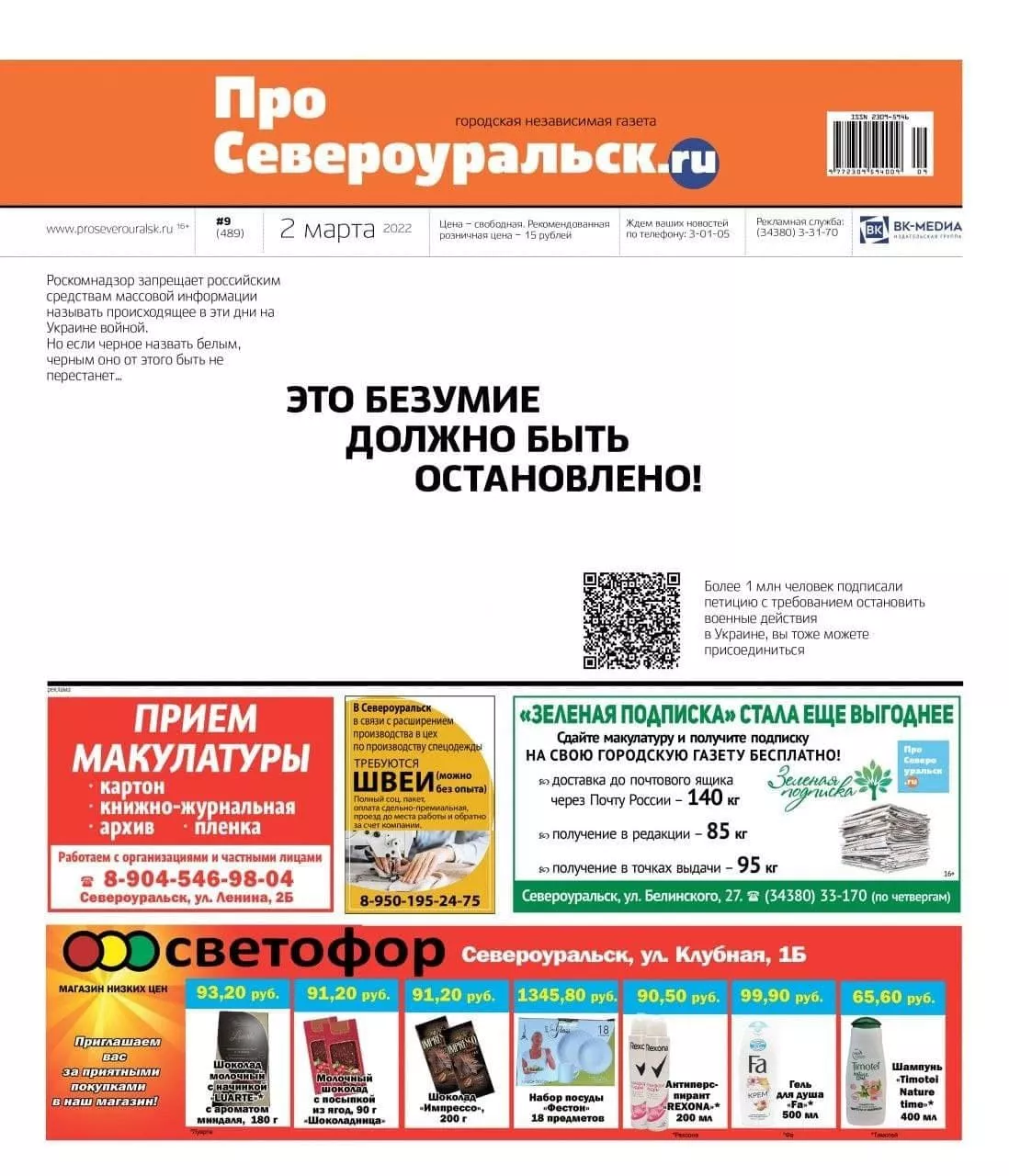 На первых полосах газет было написано: «Это безумие должно быть остановлено!». Ниже надписи разместили QR-код на сайт с петицией президенту РФ о прекращении военной операции. Также издания упомянули, что Роскомнадзор запрещает российским СМИ называть происходящее войной. «Но если черное назвать белым, черным оно от этого быть не перестанет», — написано на главной странице.