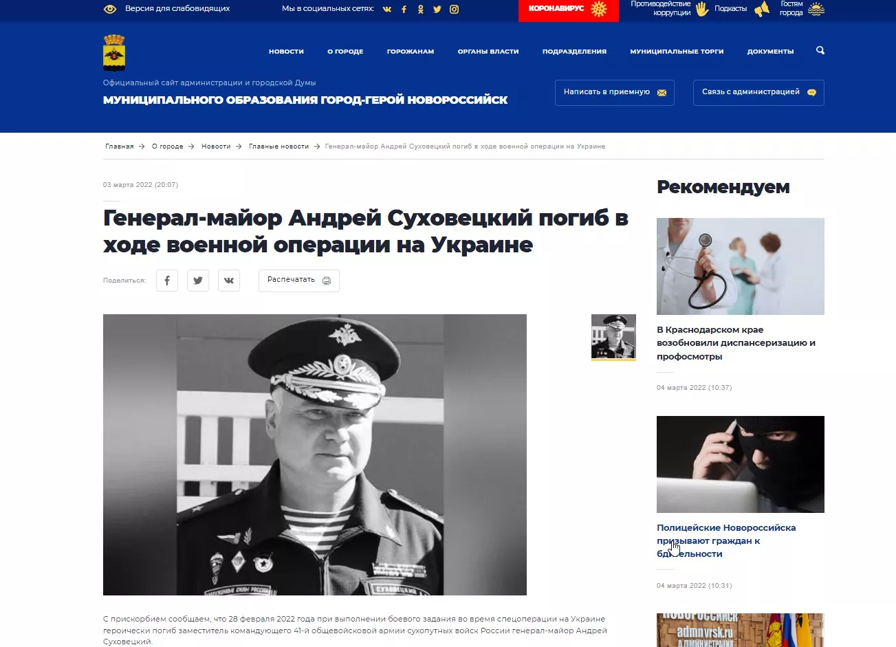 3 марта мэрия Новороссийска рассказала о гибели заместителя командующего 41-й общевойсковой армией сухопутных войск России генерал-майора Андрея Суховецкого. Он погиб 28 февраля