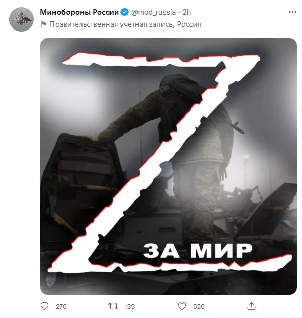 В аккаунте Минобороны России в твиттере 4 марта опубликовали картинки с буквой Z и людьми в военной форме на фоне. При этом на картинках написано «за мир» и «за правду».