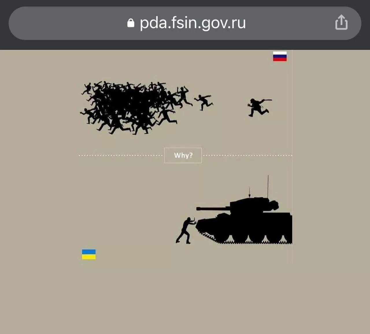 Вечером 8 марта сайты российских ведомств снова взломали. Кибератаки обрушились на ФАС, ФСИН, МВД, Роскомнадзор, Минкульт и Минцифры. На главных страницах сайтов установили мем. Под флагом РФ один человек с дубинкой разгоняет огромную толпу, а под флагом Украины невооруженный человек останавливает танк.