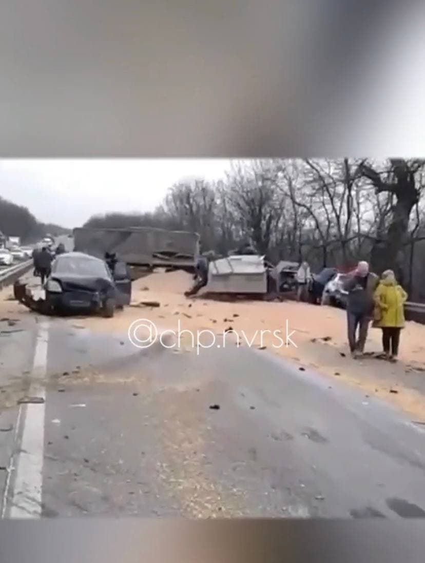 Днем 10 марта на трассе А290 Новороссийск — Керчь в районе перевала Волчьи ворота КамАЗ с зерном столкнулся с 11 легковушками. Об этом в соцсетях сообщили очевидцы. На опубликованных кадрах видно разбитые машины и рассыпанное зерно.