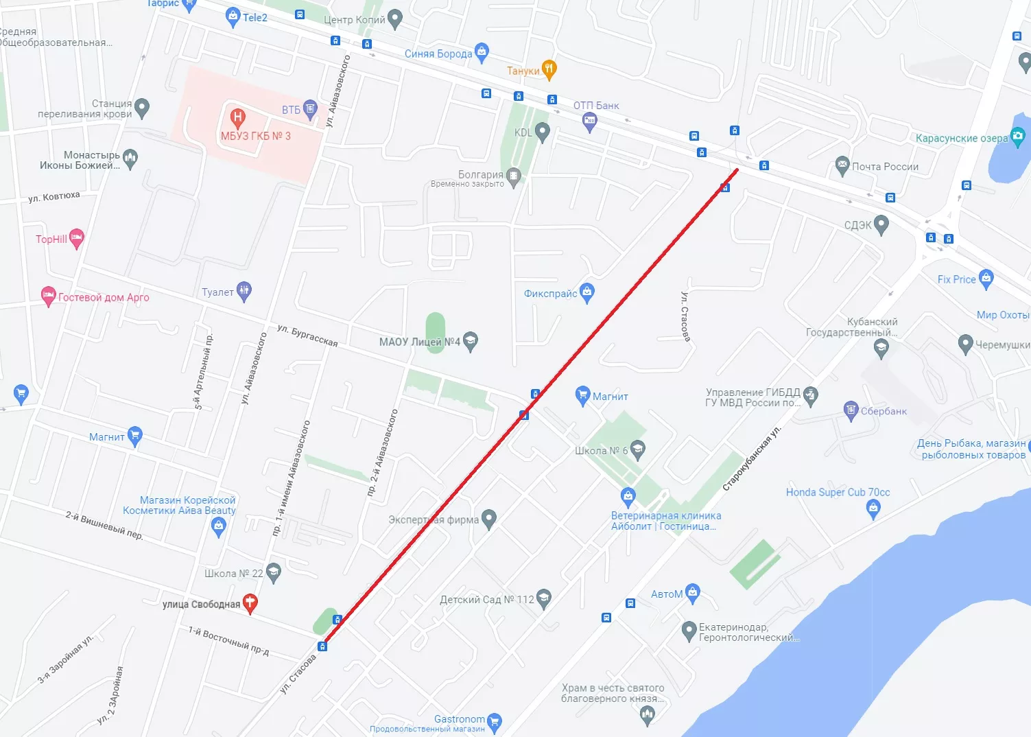 Журналистка Юга.ру побывала на месте и узнала, что на участке улицы Стасова от Свободной до Бургасской с одной стороны от трамвайных путей есть небольшое пространство между рельсами и частными домами с прилегающей к ним территорией. С другой стороны находятся многоэтажные дома. По факту там есть проезд, но он заставлен машинами, мусорными баками и гаражами, дорога сильно разбита, асфальт есть не везде.