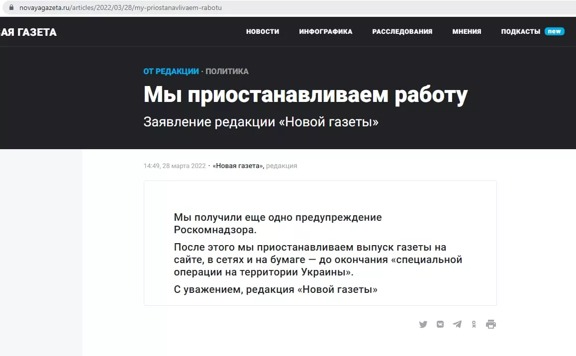 28 марта «Новая газета» объявила, что приостанавливает всю работу после очередного предупреждения от Роскомнадзора