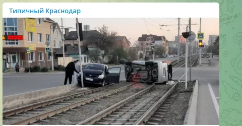 В телеграм-канале «Типичный Краснодар» очевидцы рассказал, что около 5:50 утра на перекрестке улиц Садовой и Мопр произошло ДТП. На фото, опубликованных в соцсетях, видно автомобиль, который перевернулся на рельсах.
