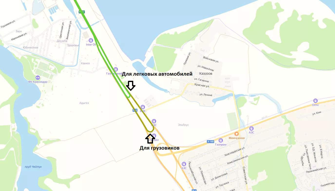 В госкомпании напомнили о существовании двух разворотных колец у хутора Казазов. Один разворот находится у заправки ОПТИ (для легковых машин), второй — у заправки «Лукойл» (для грузовиков).