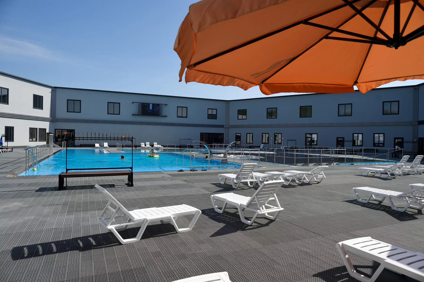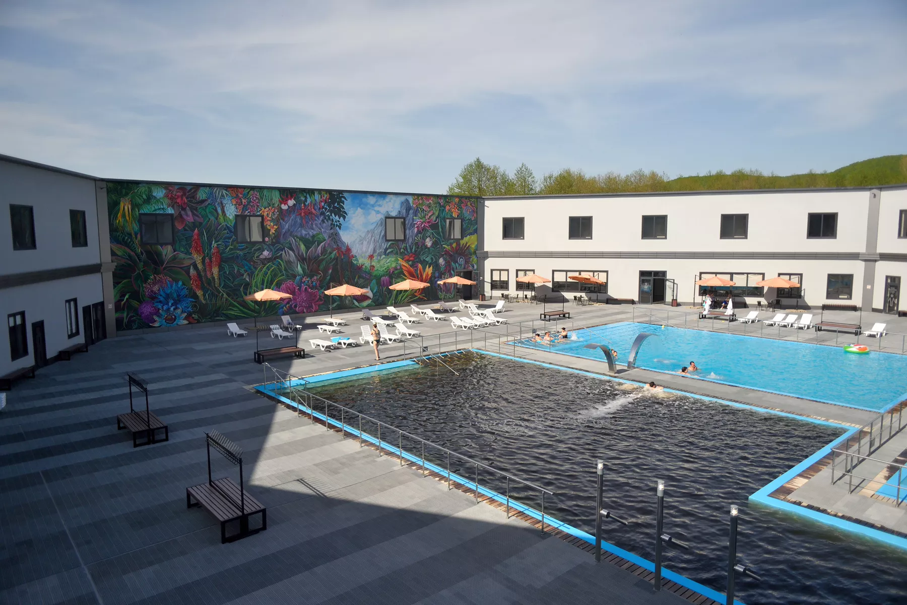 - три бассейна с теплой водой (два с термальными водами и один с пресной проточной водой) с противотоками, искусственными водопадами, гидро- и аэромассажем. Термальную воду в бассейне в течение дня фильтруют, обновляют, насыщают кислородом, а каждый вечер проводят сан- и техобслуживание, сохраняя при этом целебные свойства воды;