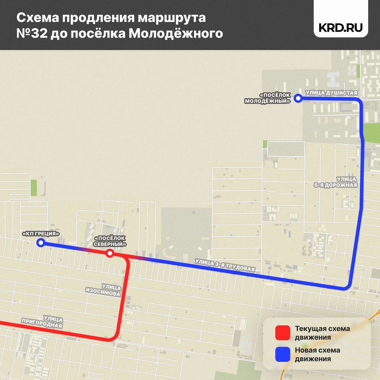 В Краснодаре автобус №32 курсирует по маршруту «улица Семиренко — 3-я Трудовая», но горожане просили продлить маршрут. Поэтому с 14 мая автобус будет ездить от улицы Александры Приймак по 3-й Трудовой до Оливковой в районе коттеджного поселка «Греция», а оттуда по улице 3-й Трудовой, 5-й Дорожной и Душистой в микрорайон Молодежный.
