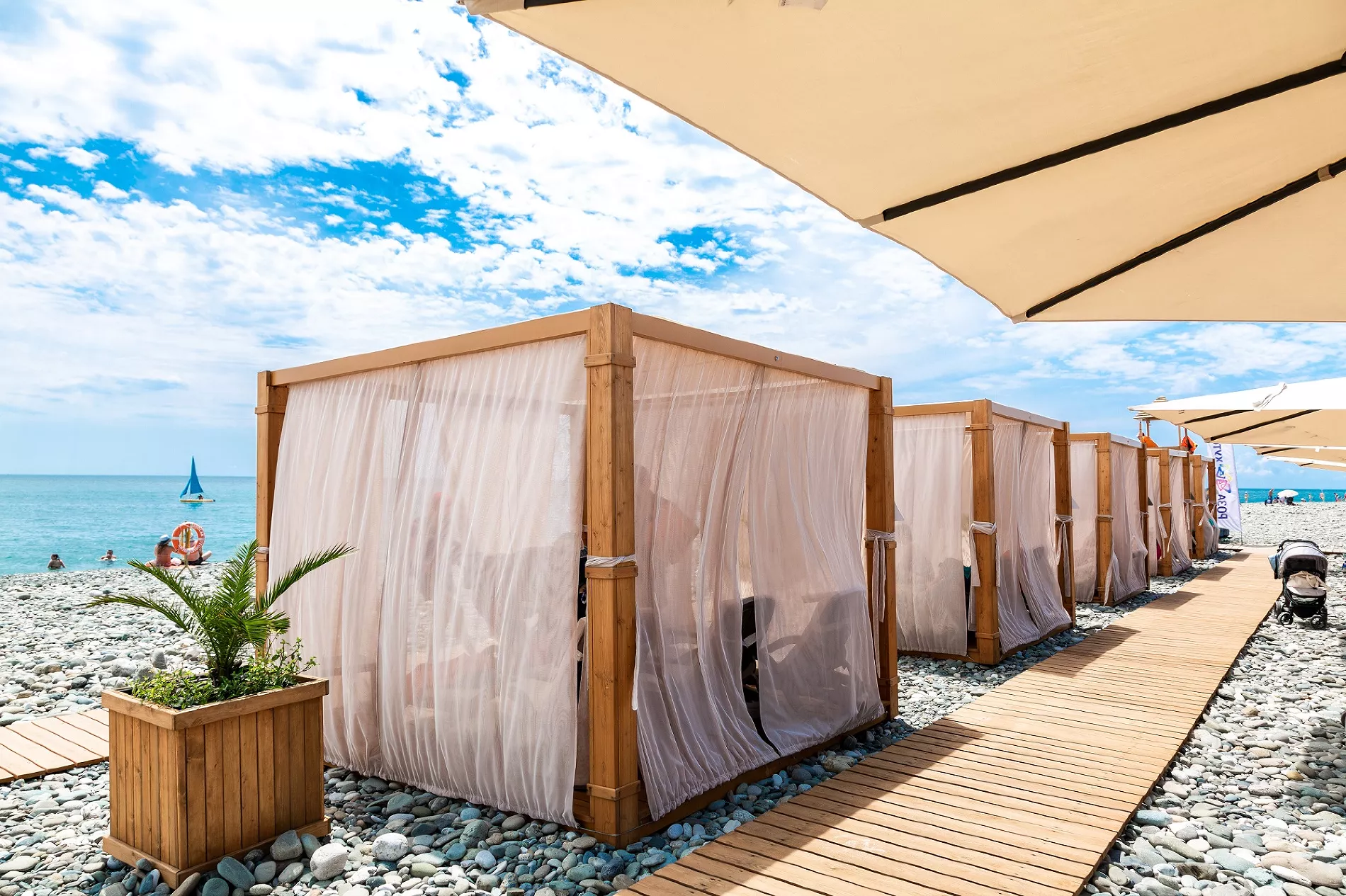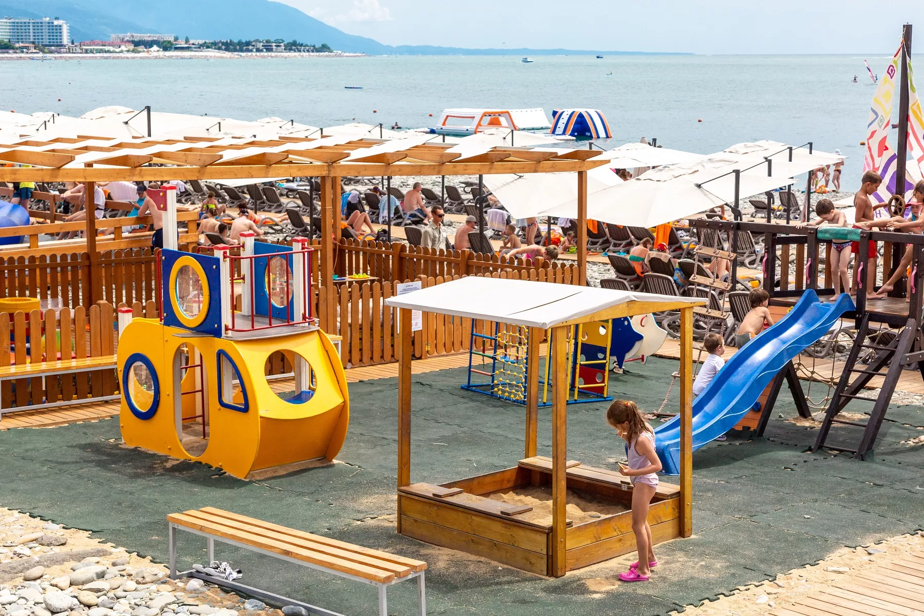На пляже есть лежаки, зонты, отдельные шатры-бунгало, полотенца и удобные раздевалки. Для детей работает анимация и детская площадка, а для любителей прыжков в воду устроили специальный понтон.