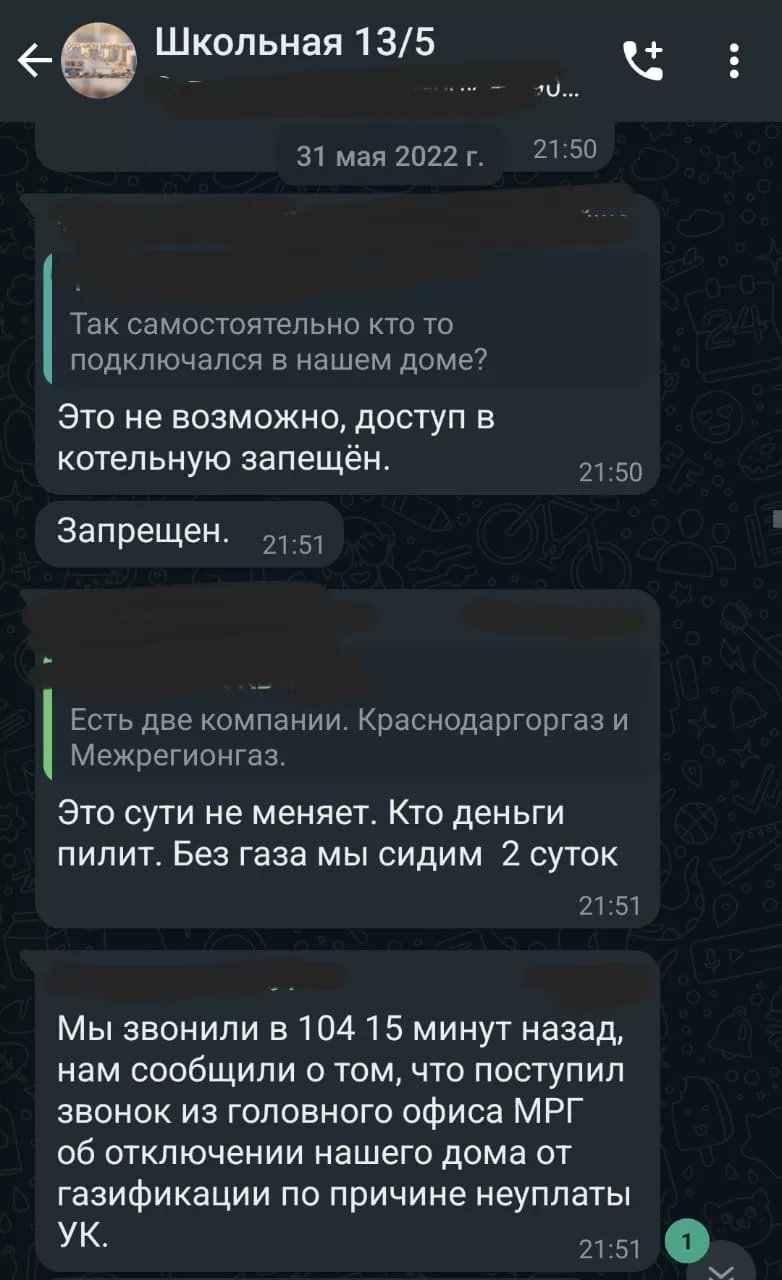 В редакцию Юга.ру 2 июня обратились жильцы многоэтажного дома по улице Школьной, 13/5 в Краснодаре. Дело в том, что 30 мая им отключили газоснабжение, из-за чего люди остались без горячей воды и возможности приготовить еду. Точную причину отключения жильцам не назвали — сначала говорили об аварии, а затем о долгах управляющей компании.