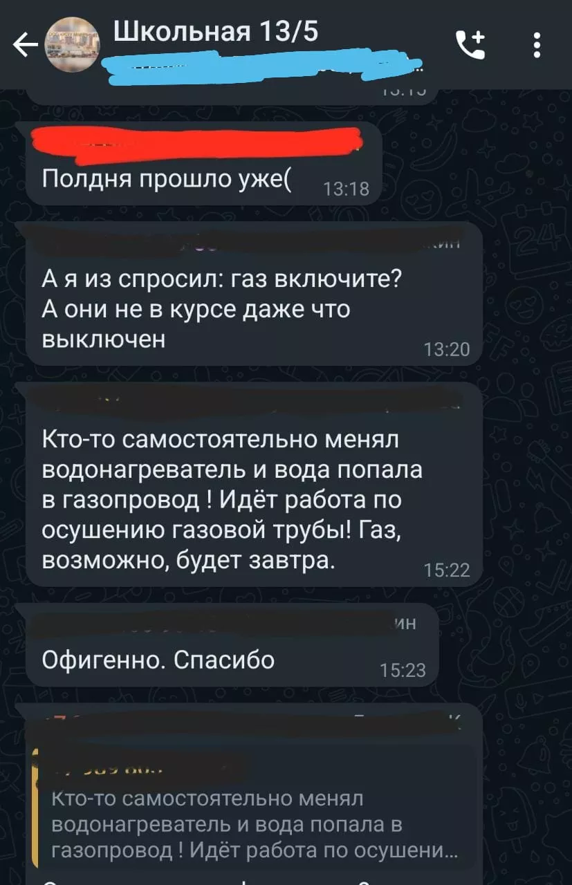 На следующий день газ так и не появился. Кто-то написал, что в одной из квартир самостоятельно меняли водонагреватель и вода попала в газопровод:
