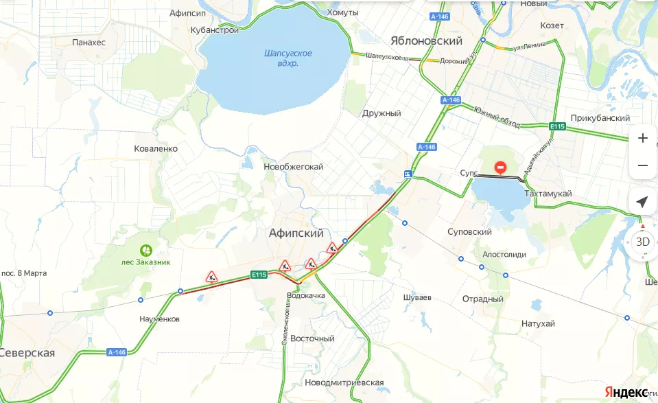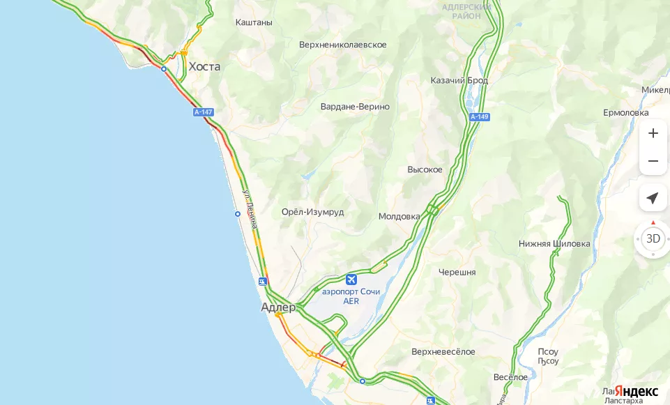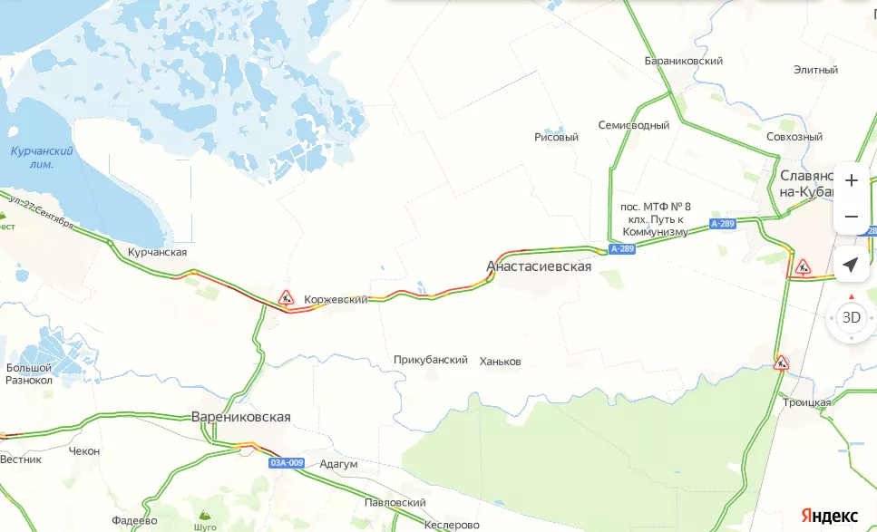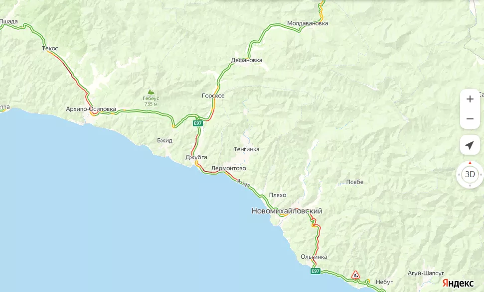 Также, судя по картам, высокобалльные пробки заблокировали движение вдоль побережья в Сочи и Джубге, в районе Крымска и посёлка Афипского, в сторону Крыма.