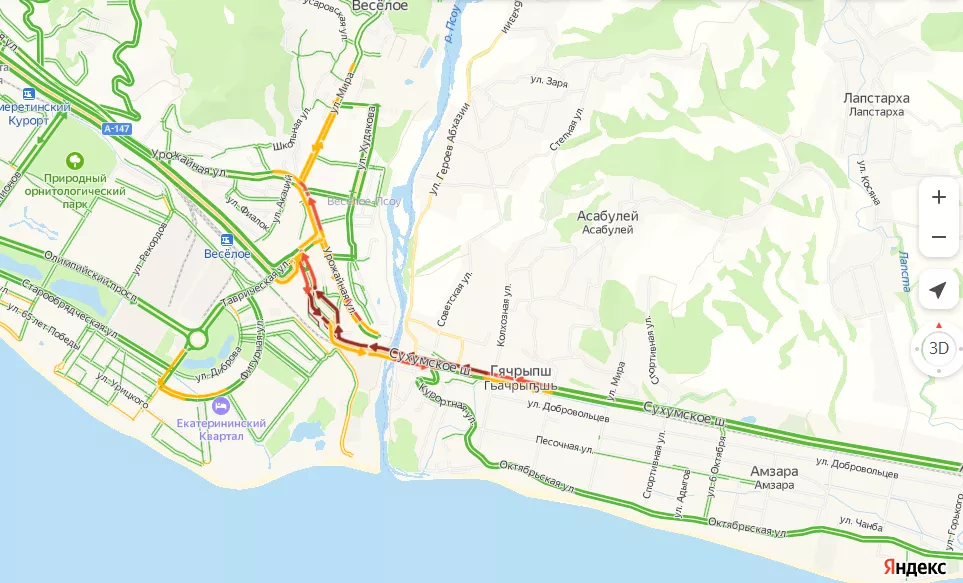 Пробка на границе России и Абхазии © Скриншот сайта «Яндекс.Карты», yandex.ru/maps