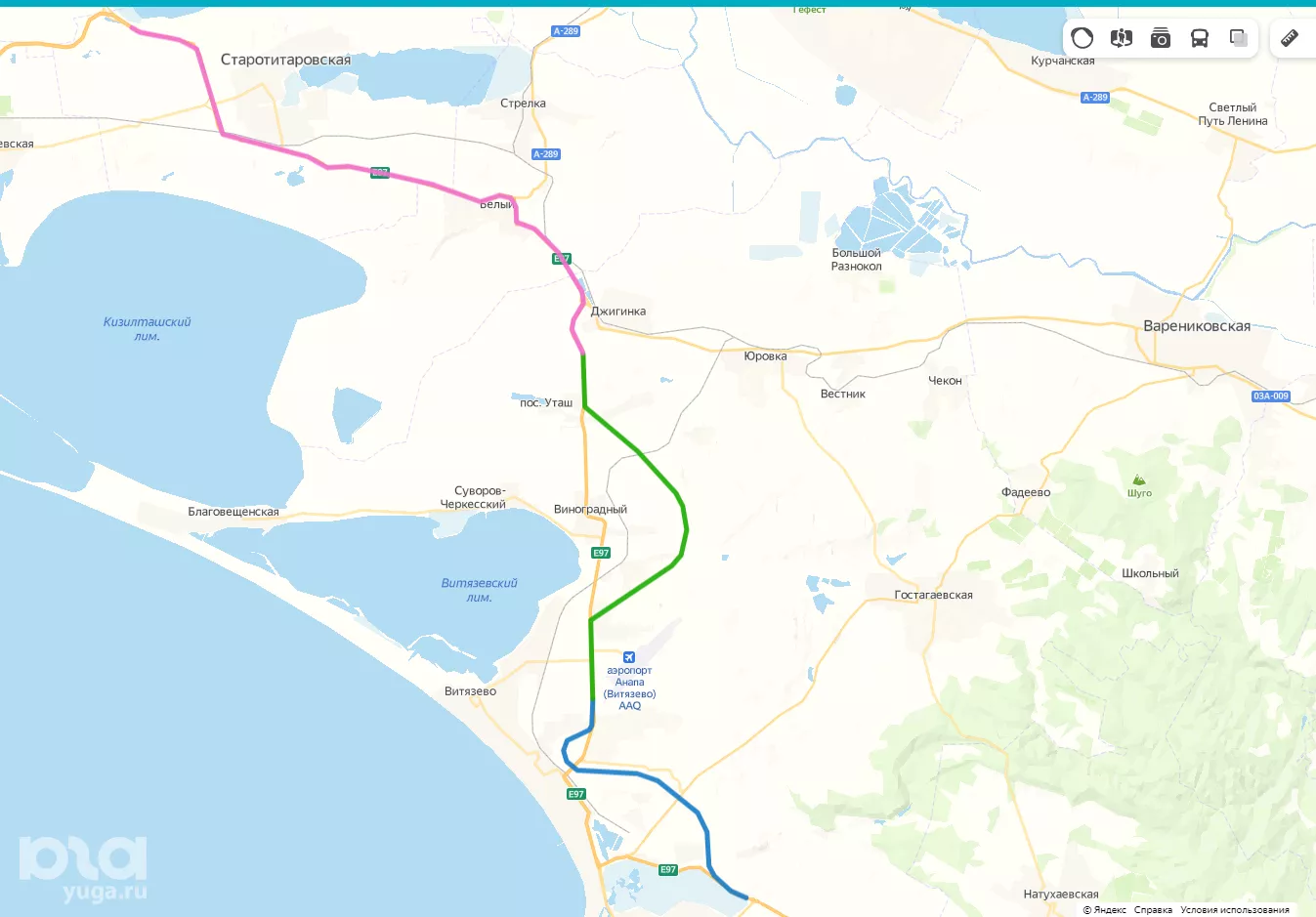 • Синий участок — северный обход Анапы (47-52 км), зелёный участок —  район п. Уташ (52-73 км), розовый участок —  район х. Белый (73-100 км) © Скриншот https://yandex.ru/maps/