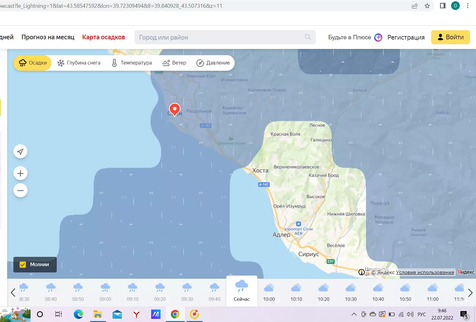 Ночью и утром 22 июля дождь прошёл в Лазаревском районе и Центральном районе Сочи. На момент публикации, согласно карте осадков, грозовой фронт подходит к Хостинскому и Адлерскому районам.