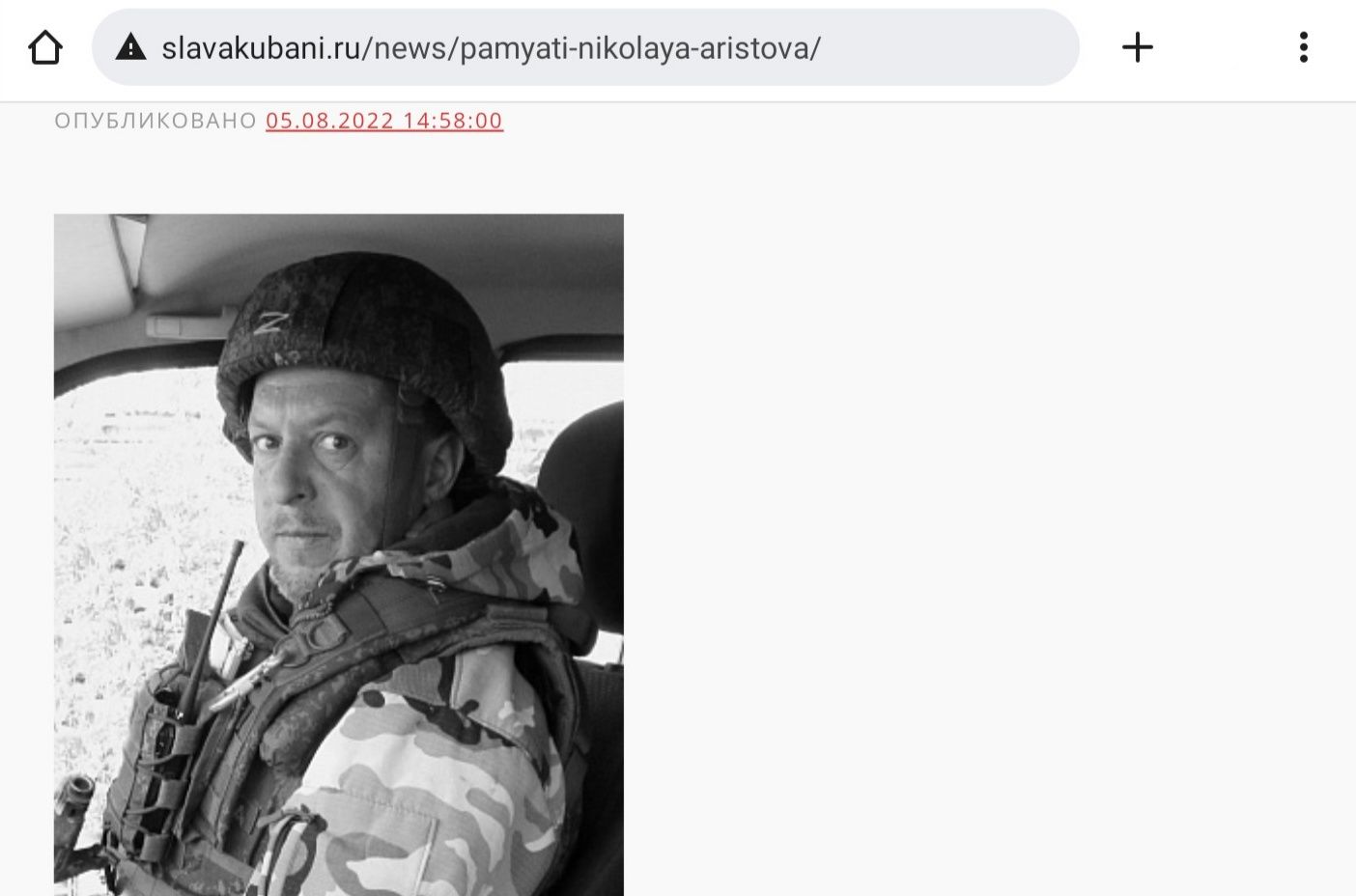 «Кубанское казачье войско выражает слова соболезнования родным и близким Николая Аристова. Он навсегда останется в памяти как верный патриот своей Родины!», — написали на сайте общества.
